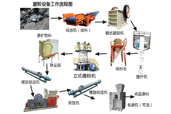 碳酸鈣在應(yīng)用于其他行業(yè)之前,一般需要制成粉狀物,其生產(chǎn)流程是大塊狀原料經(jīng)過破碎后、在振動篩分機的作用下對成品分級、之后由皮帶輸送機將篩分后的物料均勻連續(xù)的送到超細立磨磨粉機進行研磨、在鼓風(fēng)機的作用下分選,之后制成的粉末出料即為成品。